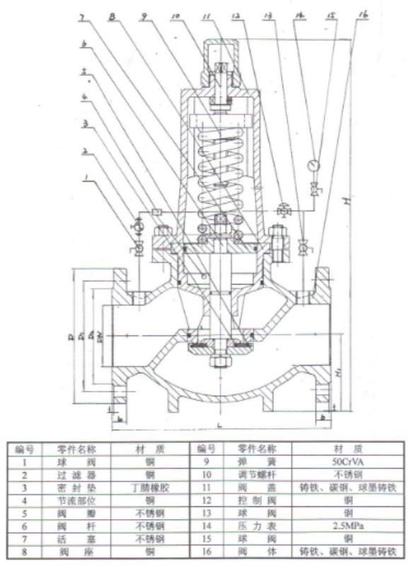 當調節(jié)彈簧處于自由狀態(tài)時,主閥和導閥呈關閉狀態(tài)。擰動調節(jié)螺釘,由介質推開導閥,同時進入主閥橡膠薄膜腔室與調節(jié)彈簧的壓力保持平衡,進入主閥橡膠薄膜腔室,使橡膠膜片向上,主閥打開,介質流向出口(此時截止閥打開,保持腔室一定的壓力),出口介質再反饋至橡膠薄膜上方腔室和導閥下方腔室。當出口壓力時,導閥的膜片上移,導閥開度減少,使腔室的介質壓力下降,同時腔室壓力下降,主閥橡膠薄膜下移,主閥的開度減小,出口壓力下降,達到新的平衡;反之亦然。