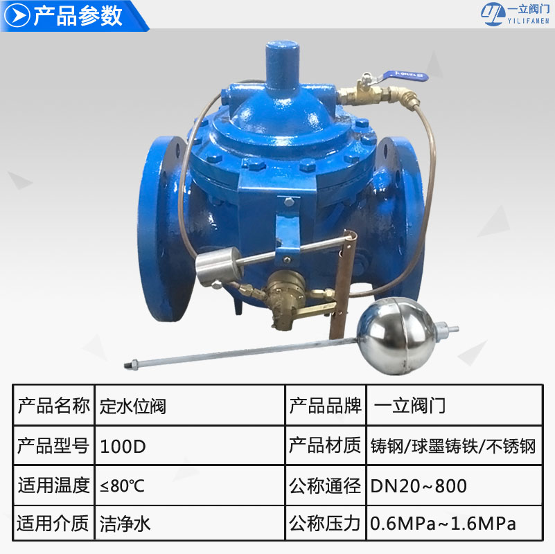 100D定水閥是一種隔膜式調節(jié)水箱和水塔掖面高度的閥門。閥門由浮球控制,當液面達到設定高度時閥門通過相關結構將信號傳遞個水泵,水泵停止貢水;當液面底于設定位置時水泵自動供水。該閥動作平穩(wěn),有效防止開泵水錘和停泵水錘的產生。避免管道產生過高的壓力。適用于水箱、水塔的自動供水系統(tǒng)。該閥保養(yǎng)簡單、靈活耐用、液位控制準確度高,水位不受水壓干擾且關閉緊密不漏水,性能可靠。